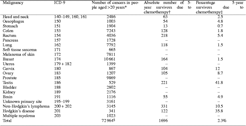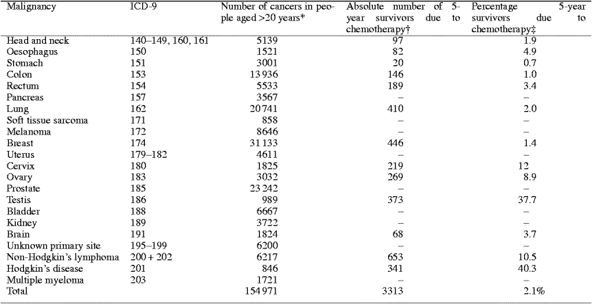 Aims: The debate on the funding and availability of cytotoxic drugs raises questions about the contribution of curative or adjuvant cytotoxic chemotherapy to survival in adult cancer patients.