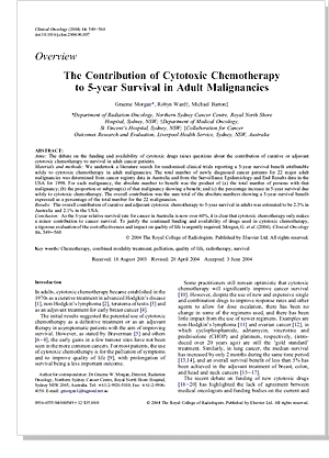 Conclusion: As the 5-year relative survival rate for cancer in Australia is now over 60%, it is clear that cytotoxic chemotherapy only makes a minor contribution to cancer survival. To justify the continued funding and availability of drugs used in cytotoxic chemotherapy, a rigorous evaluation of the cost-effectiveness and impact on quality of life is urgently required. Morgan, G. et al. (2004). Clinical Oncology 16, 549e560