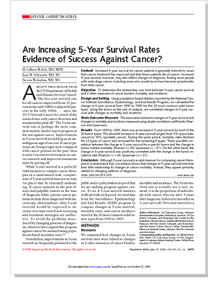 Context: Increased 5-year survival for cancer patients is generally inferred to mean that cancer treatment has improved and that fewer patients die of cancer. Increased 5-year survival, however, may also reflect changes in diagnosis: finding more people with early-stage cancer, including some who would never have become symptomatic from their cancer.